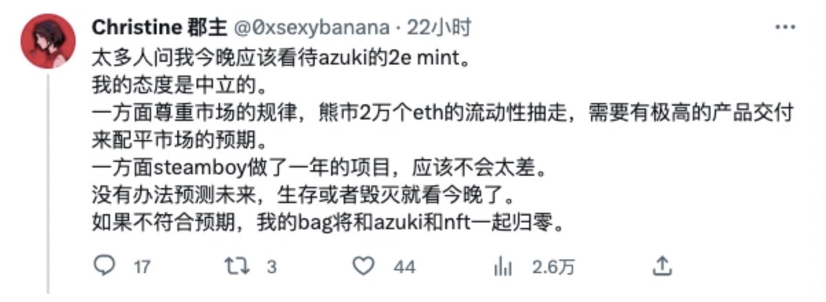 Odaily 注:知名 Azuki holder “郡主”在发售之前的判断,代表了许多社区用户的观点,即新系列“至少不会太差”。