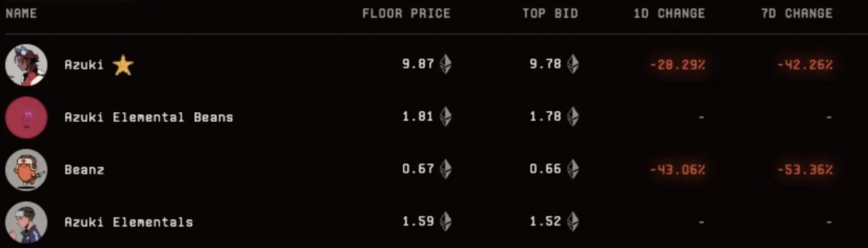 总而言之,随着社区情绪的崩溃,Azuki 系列作品全线下跌。截至发文,Azuki 地板价报 9.87 ETH,日间下跌 28.29% ;Beanz 地板价报 0.67 ETH,日间下跌 43.06% ;Azuki Elementals 也已破发,暂报 1.59 ETH;因存在开出稀有款的概率,相对之下未开图的 Azuki Elemental Beans 地板价要稍高一些,暂报 1.81 ETH。
