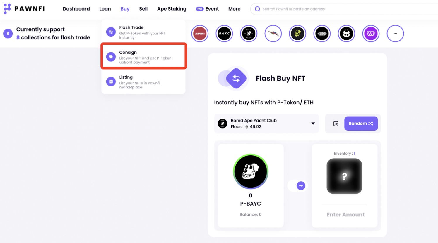 寄售:用户寄售NFT,并获得部分预付的P-Token。这个功能比较适合较高稀有度的持有者,不愿意地板价售出又想要地板价的流动性进行操作。