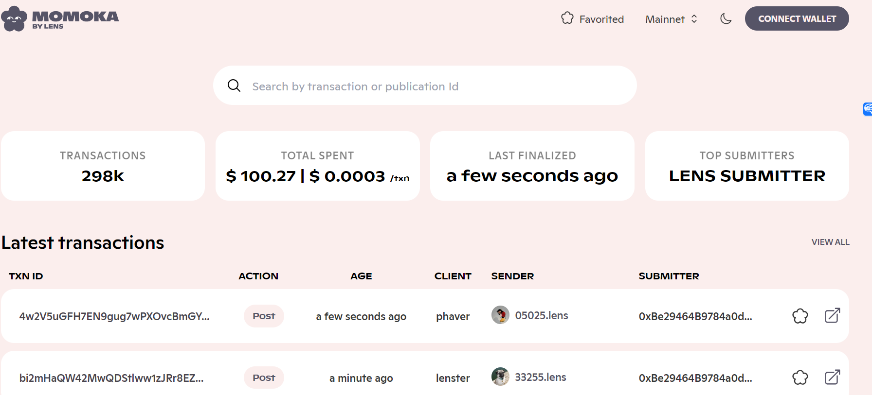 目前,Momoka支持的交易包括发布内容出版物、评论和镜像。根据Momoka Explorer显示,截至6月27日Momoka上已经完成的交易笔数29.8万笔,总链上交易花费才100美元。