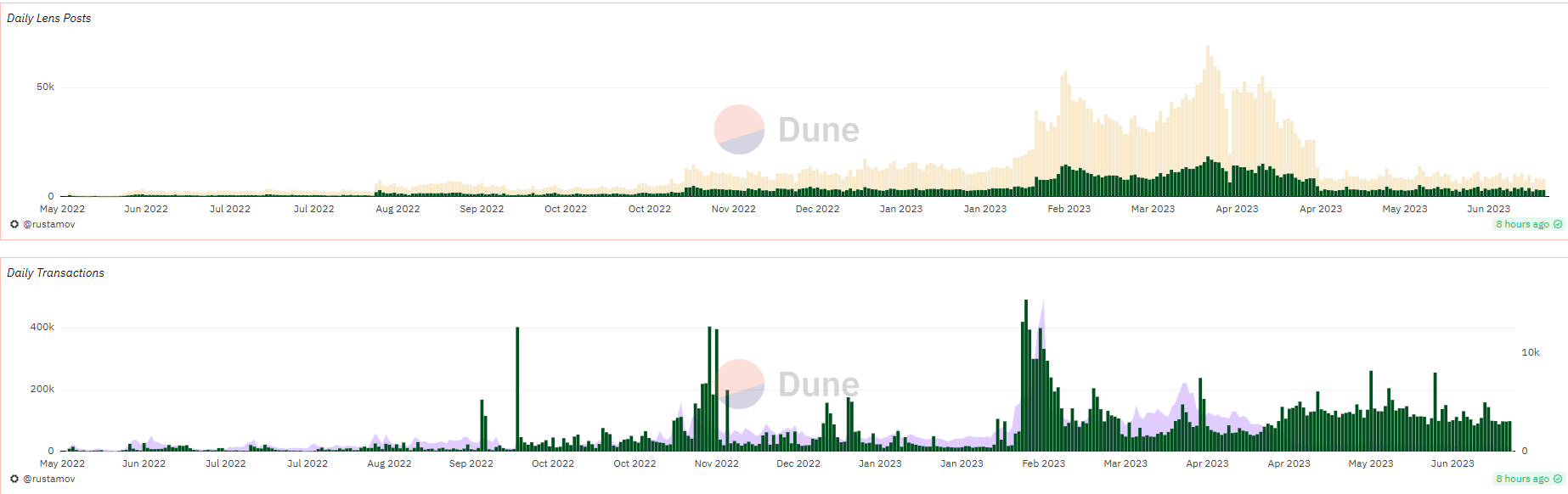 从用户活跃数据走势上来看,Lens Protocol活跃用户数其实并不是一直那么低,平台最活跃集中在今年2月、3月、4月份,日活跃用户数长期维持在1.5万上下,每日发布的帖子数量也在4万左右,每日交易笔数最高可达40万以上。自4月27日开始,日活数据骤减,日活地址数一直维持在3K上下。主要是因为Lens Protocol暂停了Profile NFT白名单铸造申请。
