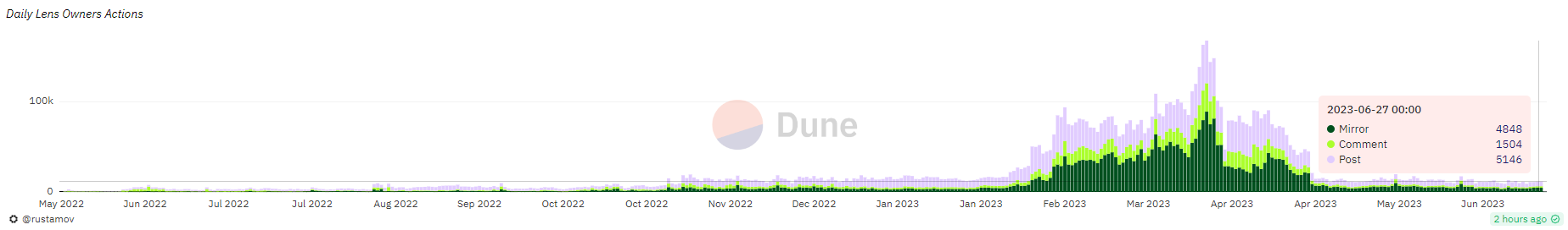 尽管Lens Protocol一直在产品开发上努力着,但是从用户活跃相关数据来看表现并不理想。根据Dune平台数据显示,当前每日活跃的钱包地址数(UAW)在2.9k左右,每日发生的交易笔数约为1.5万左右,每日发布的帖子数为5000左右,评论为1500,转发量4000左右。