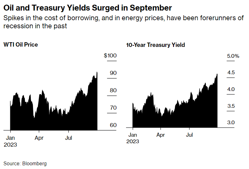 收益率曲线:9 月的抛售将 10 年期国债的收益率推高到 16 年来的最高水平,达到 4.6%。长期较高的借款成本已经将股市推向下降通道。它们也可能使住房市场陷入危机,阻止企业投资。