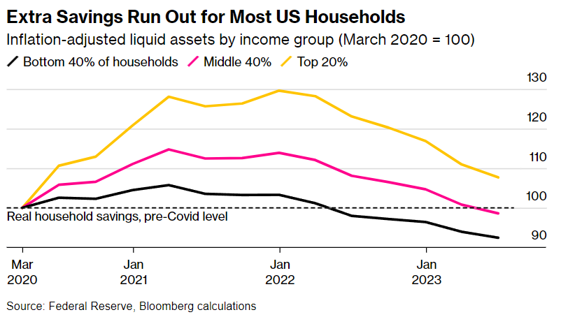此外,美国人在疫情中积攒的额外储蓄基本来自于政府的补贴,现在这些即将被耗尽,有争议的是速度有多快。彭博的计算显示,最贫困的80%的人口现在手头的现金比 Covid 之前还要少。