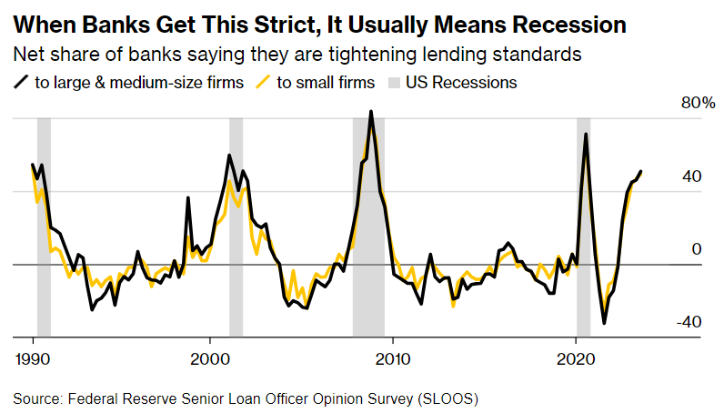 不仅如此,信贷紧缩才刚刚开始。下面是一个具有很有预警能力的贷款指标:美联储对银行高级贷款官员的调查,称为 SLOOS。