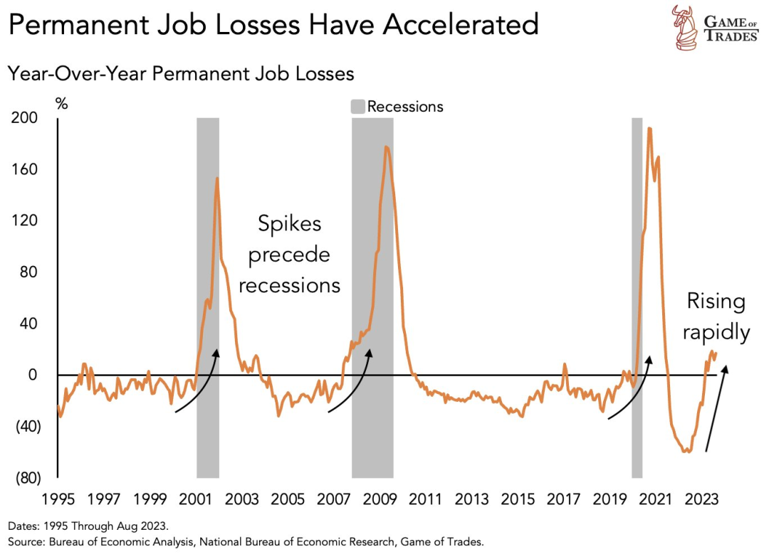 最新数据显示,大中型银行中约有一半正在对商业和工业贷款采取更严格的标准。除了疫情期间,这是自 2008 年金融危机以来的最高比例。其影响将在今年第四季度显现——当企业不能轻松借款时,通常会导致投资和招聘的减弱。