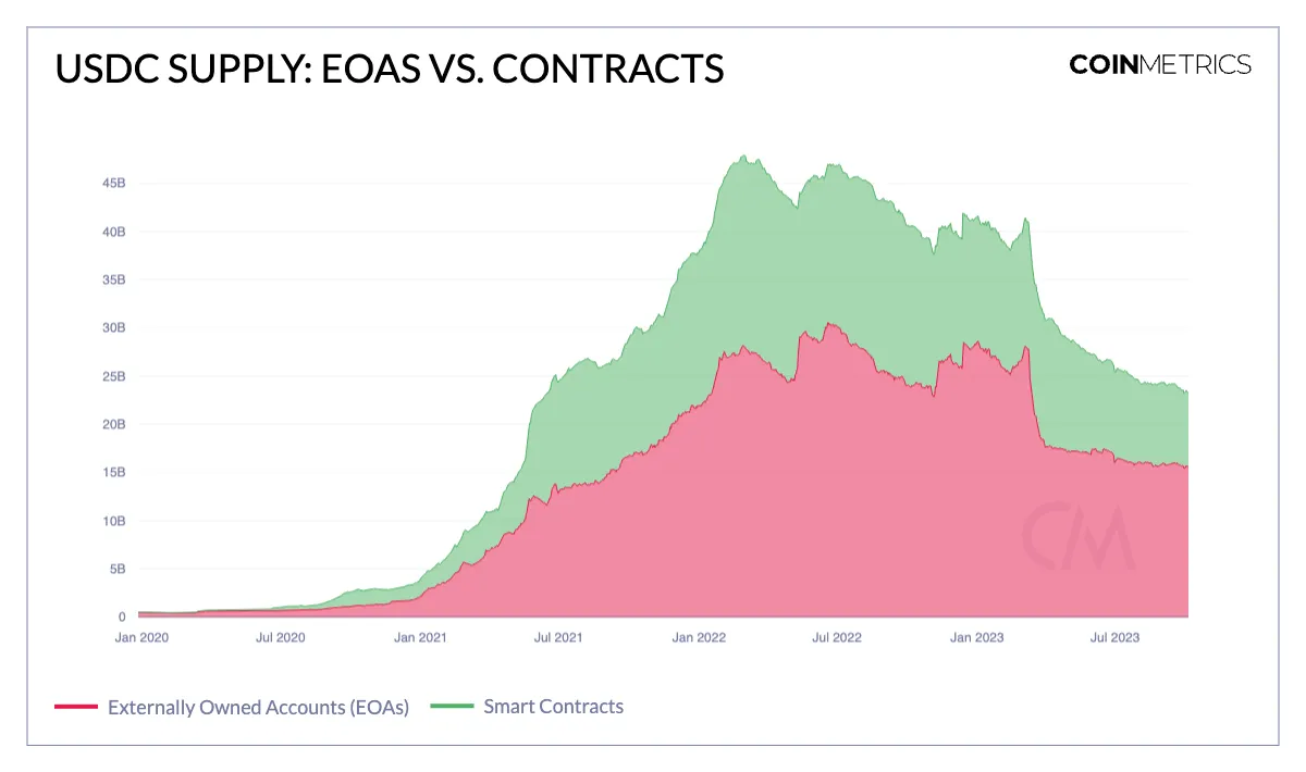 首先,我们比较智能合约中持有的 USDC 与普通以太坊账户(在以太坊术语中也称为外部拥有账户 EOA)中持有的 USDC。 目前,约 76 亿美元的 USDC,约占总数的三分之一,由智能合约持有。 这标志着从 2023 年初的 130 亿美元下降了 44%。 EOA 也经历了类似的收缩,从 280 亿美元下降到 150 亿美元。 有趣的是,自 SVB 危机的直接后果缓解以来,供应量损失的更大比例来自智能合约。