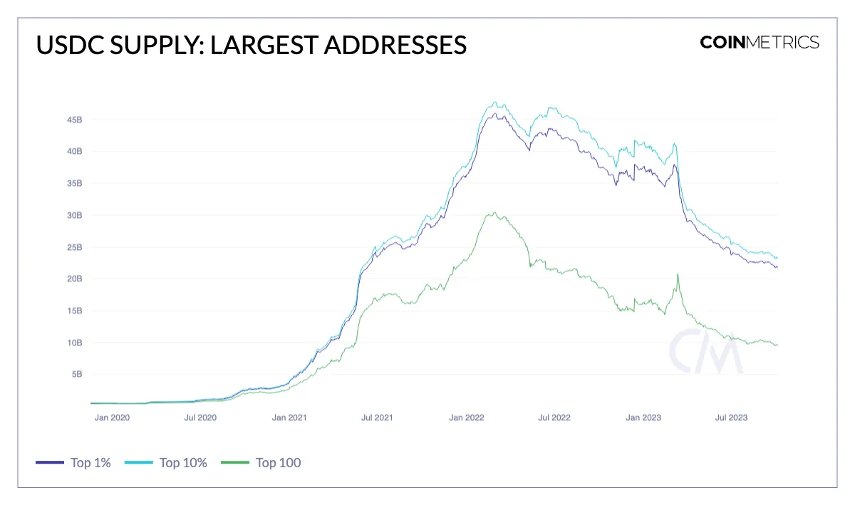 2023 年 USDC 供应量收缩的结构呈现出一个多方面的叙述,但几个趋势凸显出来。 在这里,我们按不同类别划分供应量: