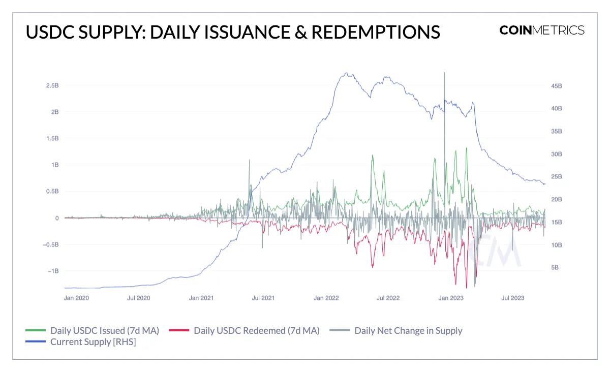 但是,USDC 供应量的大量流失似乎正在放缓,如下图所示。 然而,赎回和发行的日交易量仍远远低于 SVB 倒闭前的水平。